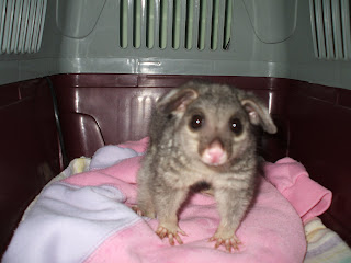 Well two days ago we took lucky the possum to the vet with his rash and he is now on a new cream instead of bathing him (thank god) as he was becoming quite distressed not that the cream is any better he still hates us. He proved that by climbing up on my shoulder after putting the cream on him and reversing up to my neck and peed all down my shoulder and in my hair and then he poohed all down my back ( he is just a charming little fellow). The cream must be starting to work on him though as the third dose he laid on his back in my lap and went to sleep (now that was cute). I would just like our healthy happy little possum back and not the one at the moment that hisses, scratches, bites, pees and poohs all over us. (I am sure he would like to be back to).